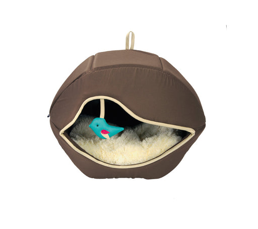 Printemps Cat Playhouse and Bed. A stunning hiding place for your playful tomcat. Fancy shaped opening with little bird hanging in the entrance....