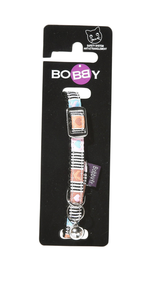 A colourful and cute cat collar with a braid pattern including hearts, birds and stripes for your Feline friend. Complete with a bell and the "saf...