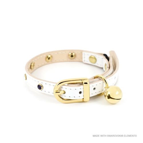 Hochwertiges Katzenhalsband aus weißem Leder, komplett mit fünf Swarovski-Elementen in Topas, Grau, Aqua, Transparent und Lila. Diese schöne Kom...