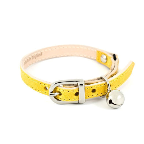 Collier pour chat en cuir jaune de haute qualité. Joint élastiqué pour plus de sécurité. Boucle et grelot assorti en Nickel. Circonférence ...
