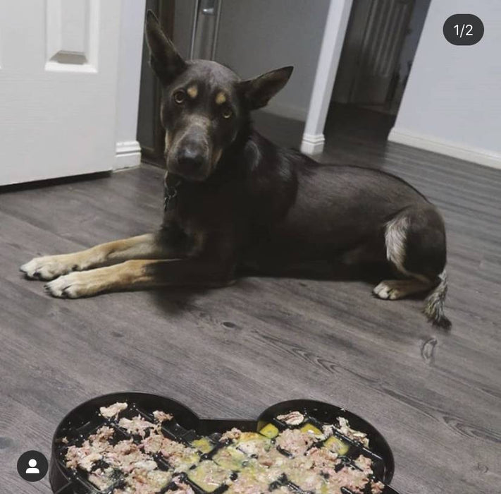 SloDog est une approche unique de l'alimentation lente ou anti-avalement. En passant d'un bol à une assiette, une surface beaucoup plus grande est disponible pour le chien d'alimentation. Tous les aliments sont bien en vue et n'ont pas besoin d'être chassés, évitant ainsi la frustration. Nous avons simplement conçu un appareil qui divise le repas en plusieurs mini-repas en répartissant la mesure dans de nombreuses petites poches peu profondes. Le chien mange simplement un mini repas à la fois. Si le chien essaie de manger dans deux poches à la fois, la nourriture tombe de la gueule ouverte du chien.