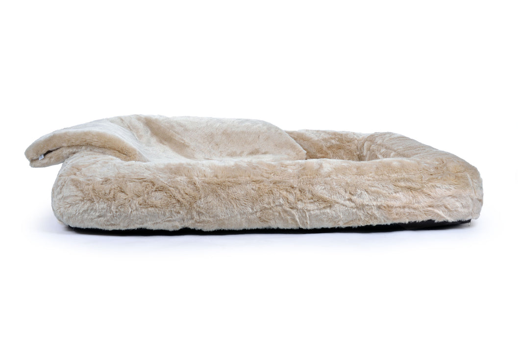 Alors que le coussin intérieur - rempli de mousse froide en standard - offre une surface de couchage stable et stable, les larges bords rembourrés sont certainement le point culminant de la fausse fourrure printanière du point de vue d'un chien : épais doublés de ouate de polyester, ils forment une couche optimale surface d'appui-tête pour se blottir.